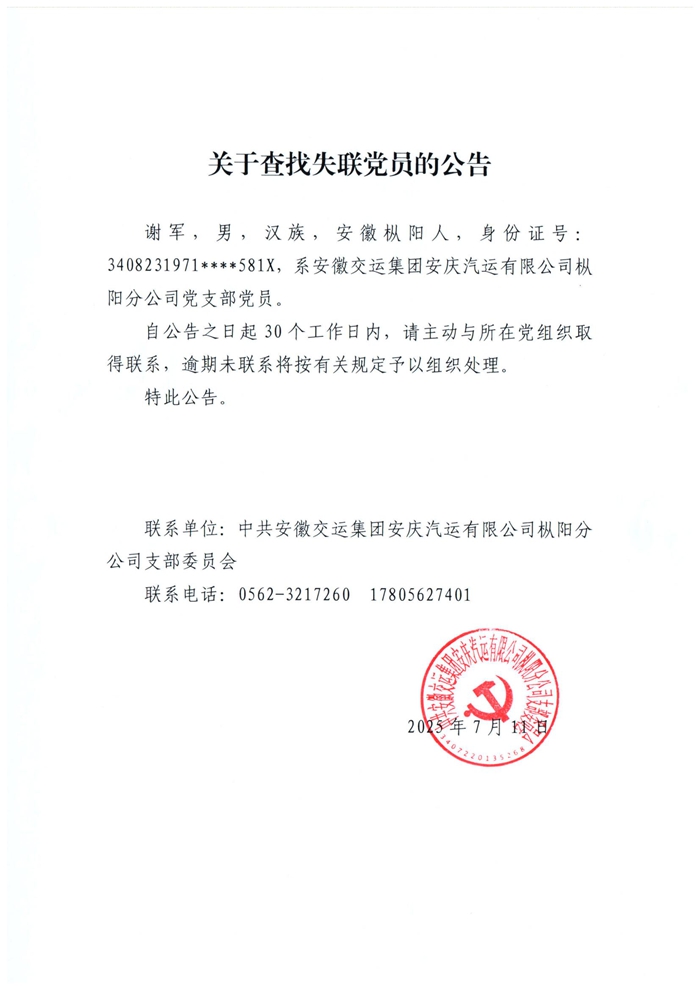 樅陽分公司黨支部關(guān)于查找失聯(lián)黨員的公告