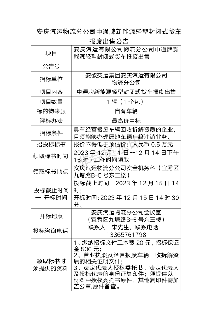 安慶汽運(yùn)物流分公司中通牌新能源輕型封閉式貨車 報廢出售公告