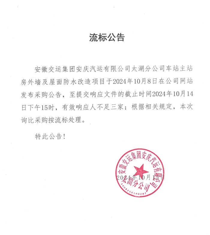 太湖分公司車站主站房外墻及屋面防水改造項目流標(biāo)公告